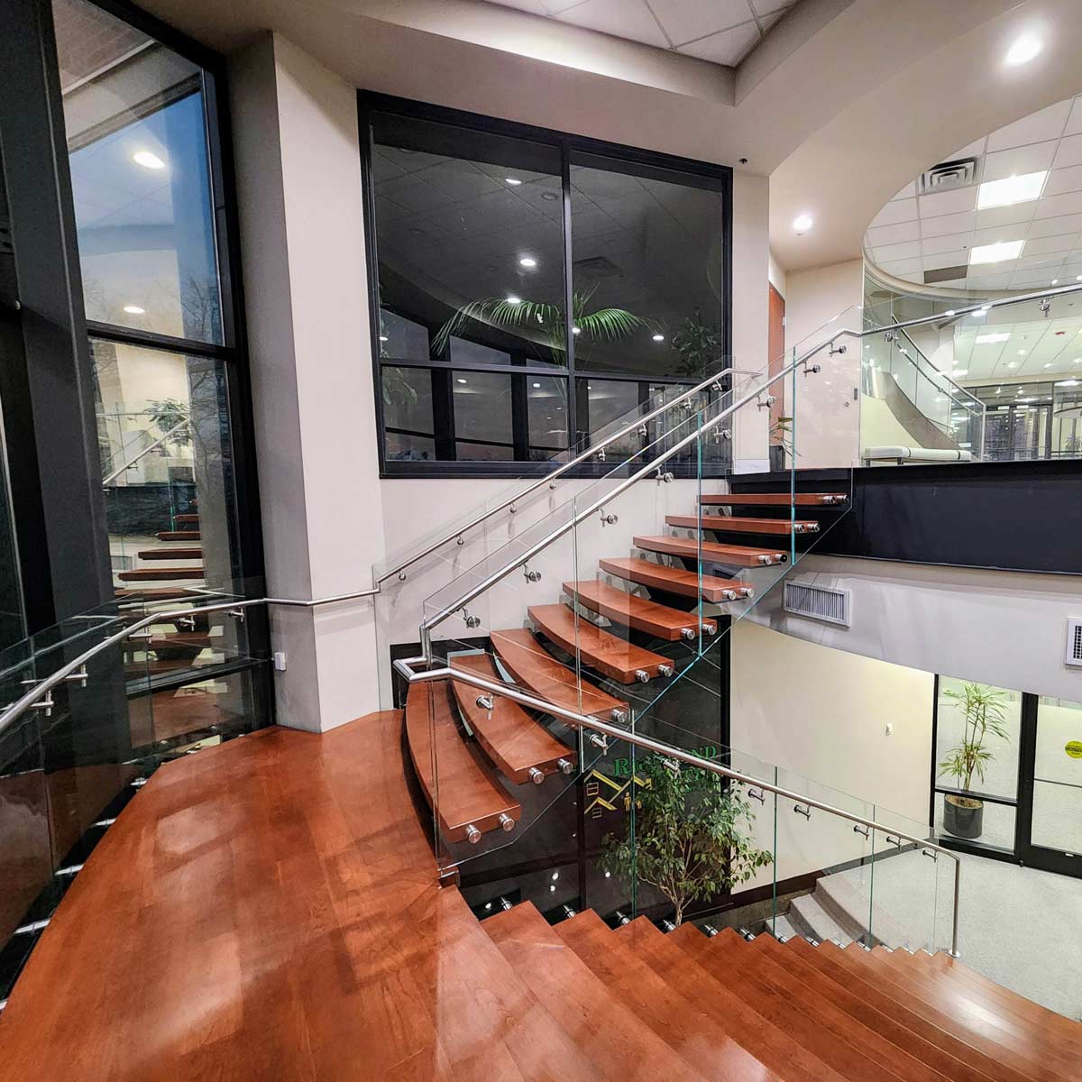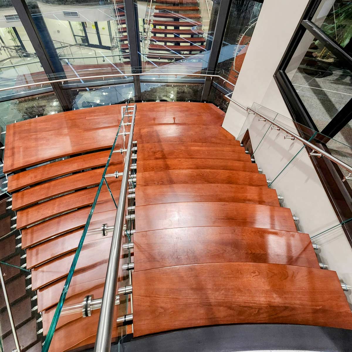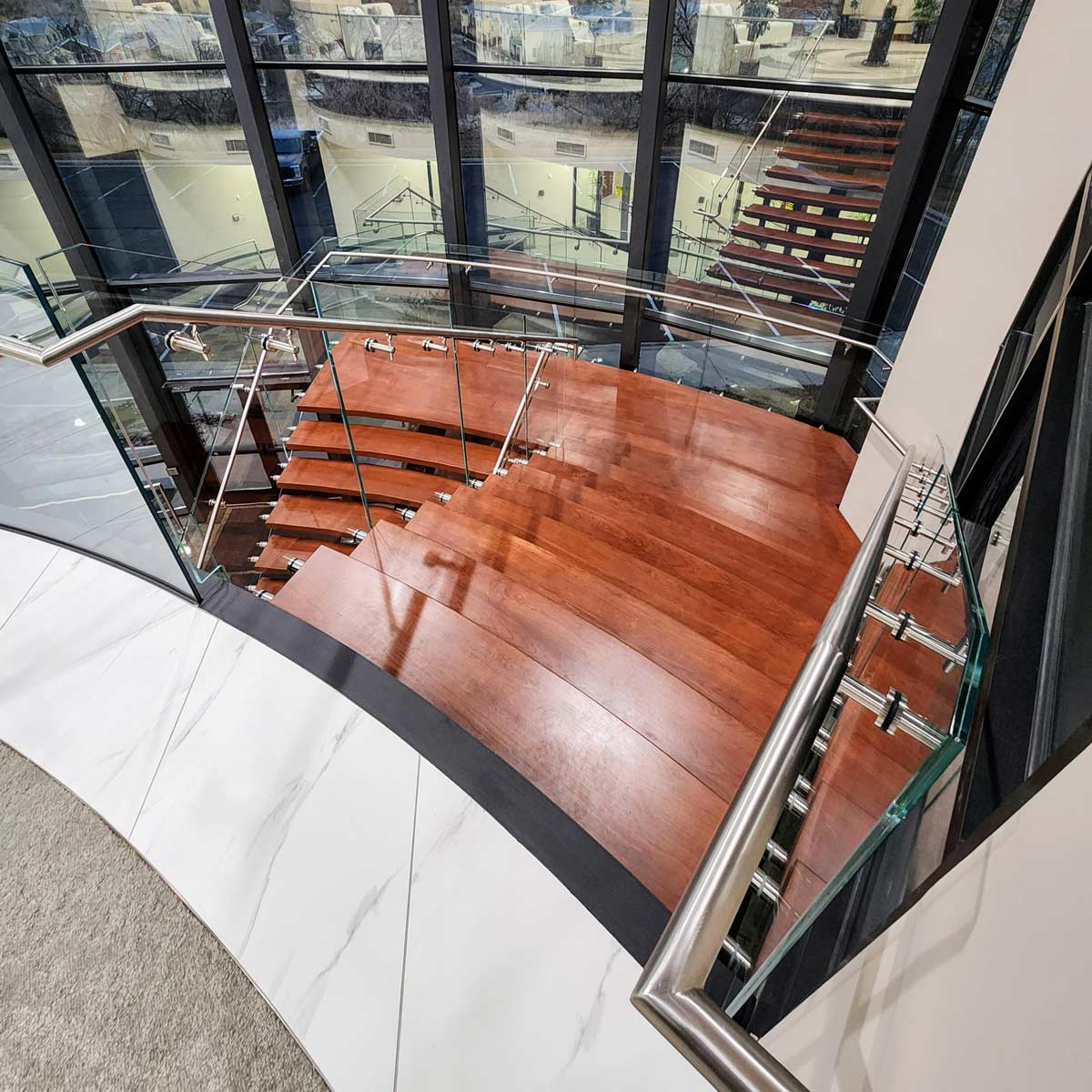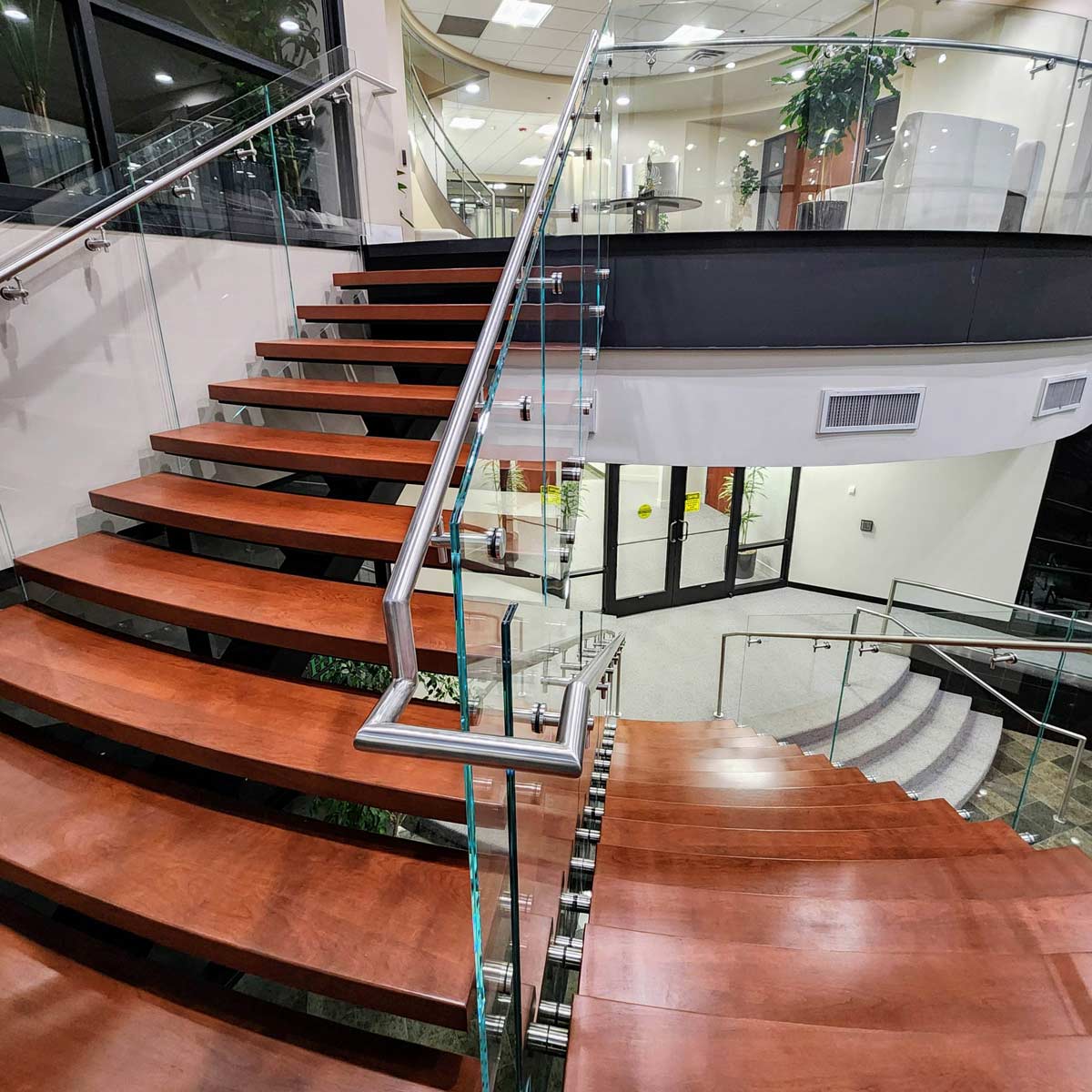 A little commercial project here and there is always fun! This project incorporates a steel mono stringer with American Cherry concave & convex block treads & landing (to play off of the existing radius of the upper floor and the grey steps leading up off the entry). Then finished it off with frame-less glass guardrails and brushed stainless steel handrails and hardware throughout. Clean, simple, and elegant…just as we like it!