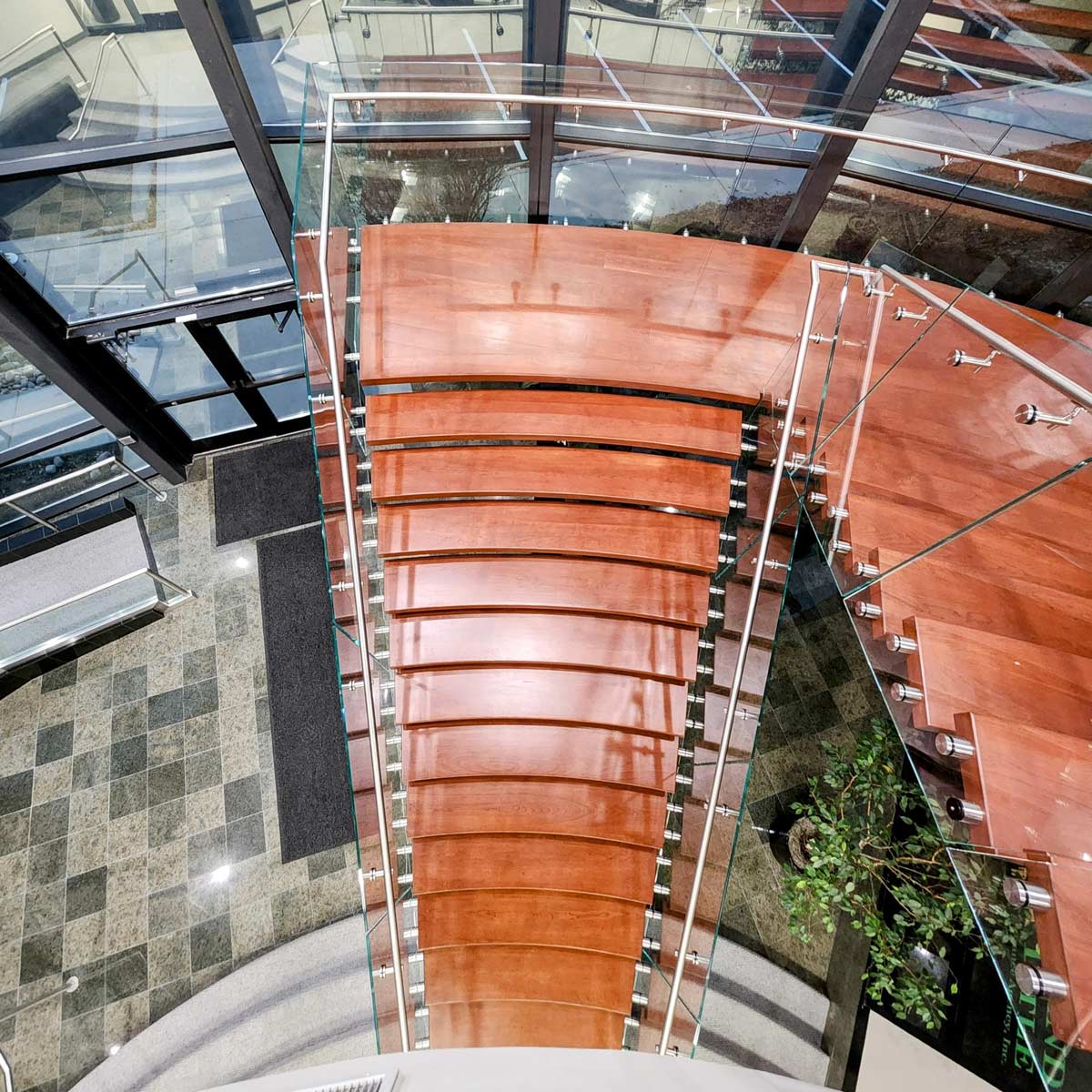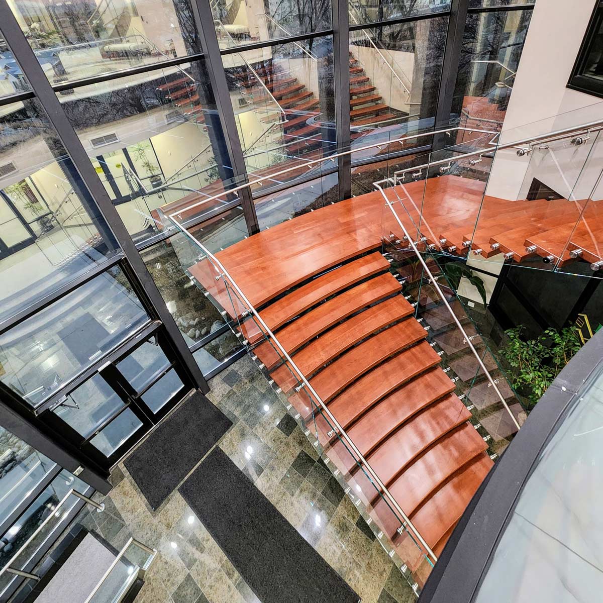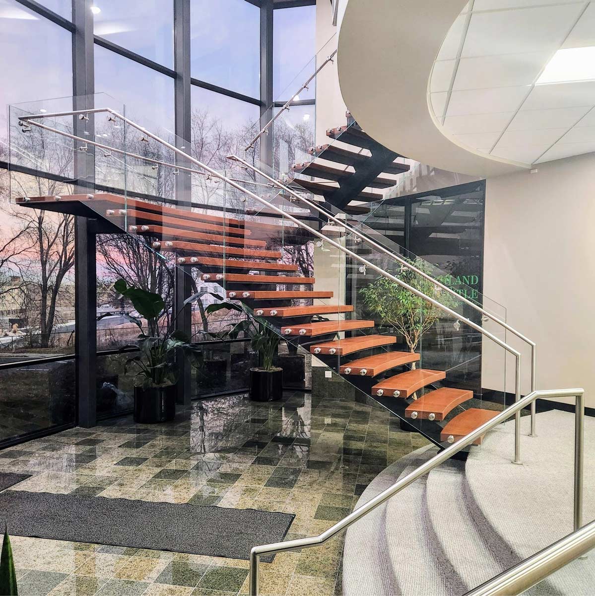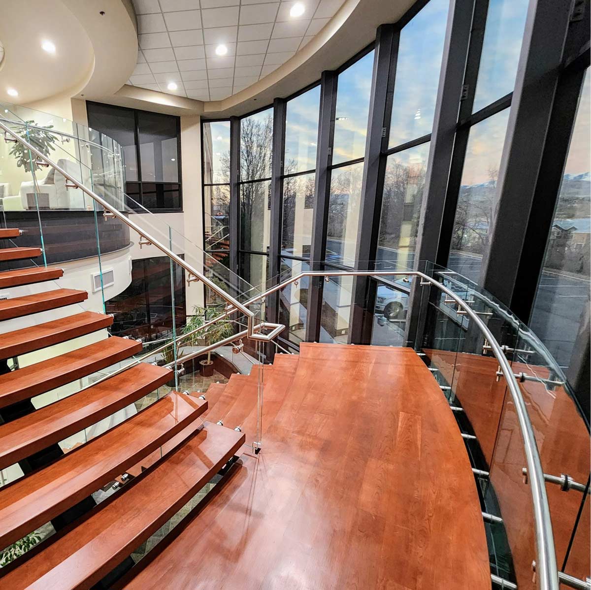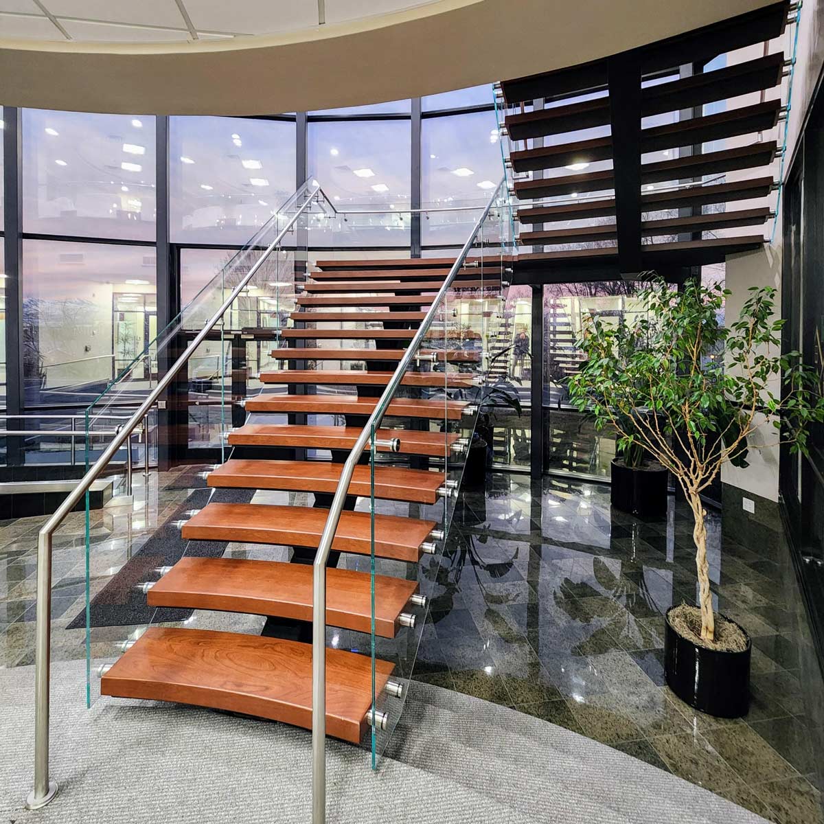 A little commercial project here and there is always fun! This project incorporates a steel mono stringer with American Cherry concave & convex block treads & landing (to play off of the existing radius of the upper floor and the grey steps leading up off the entry). Then finished it off with frame-less glass guardrails and brushed stainless steel handrails and hardware throughout. Clean, simple, and elegant…just as we like it!