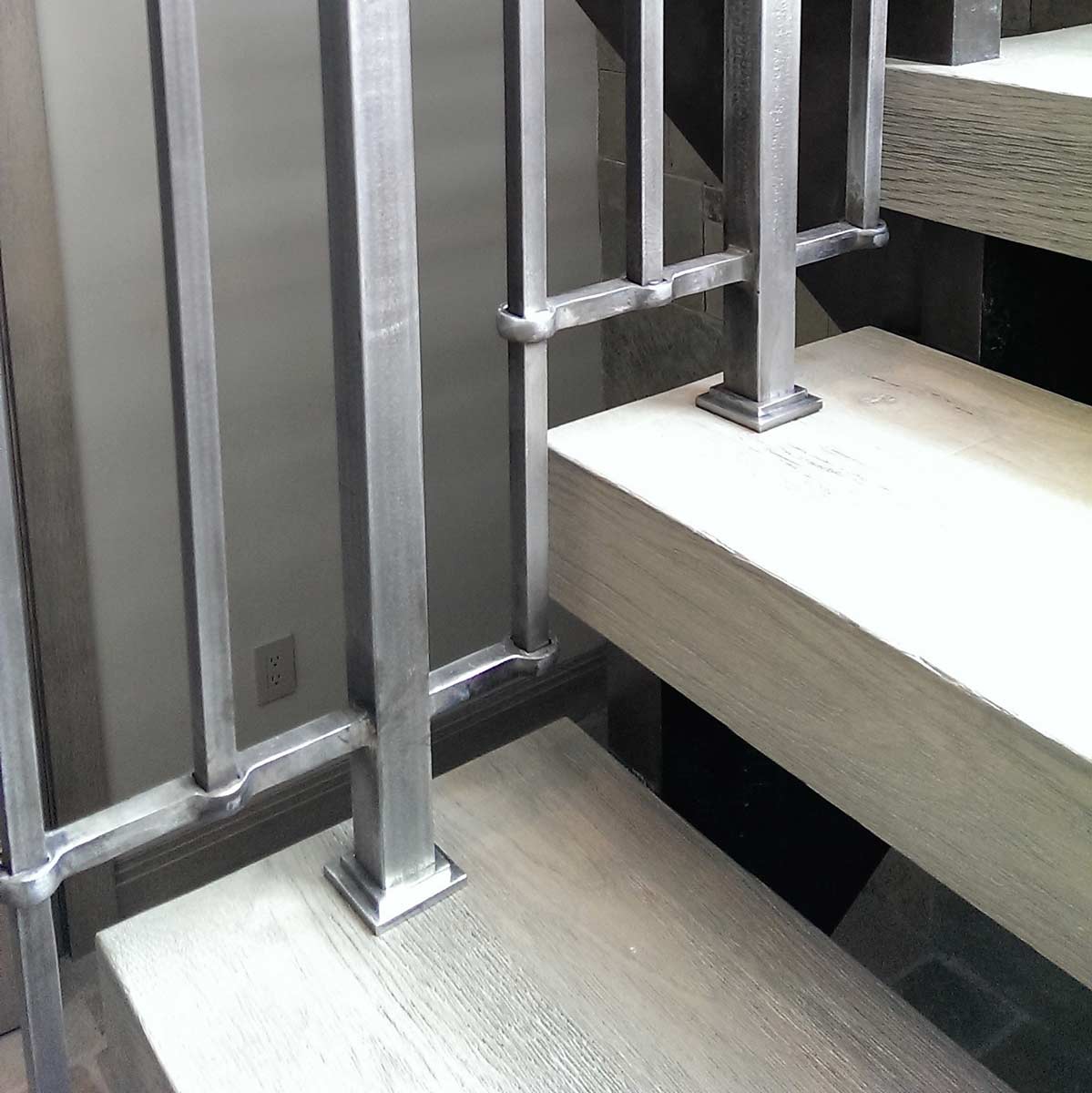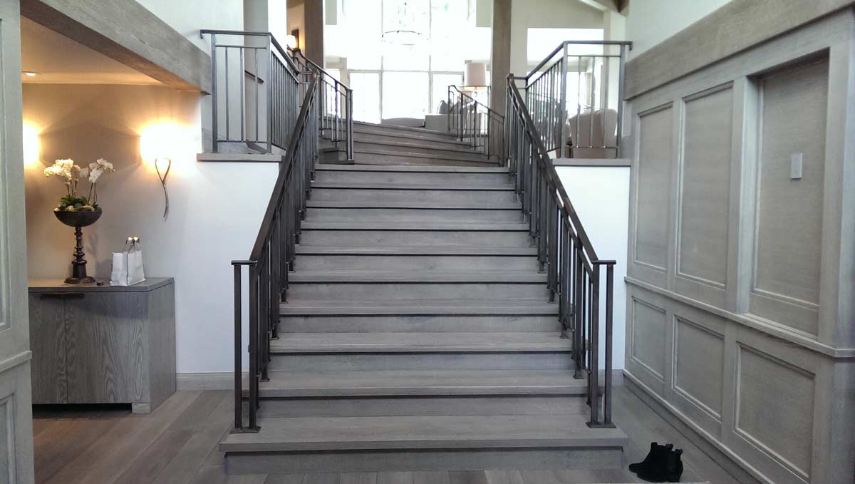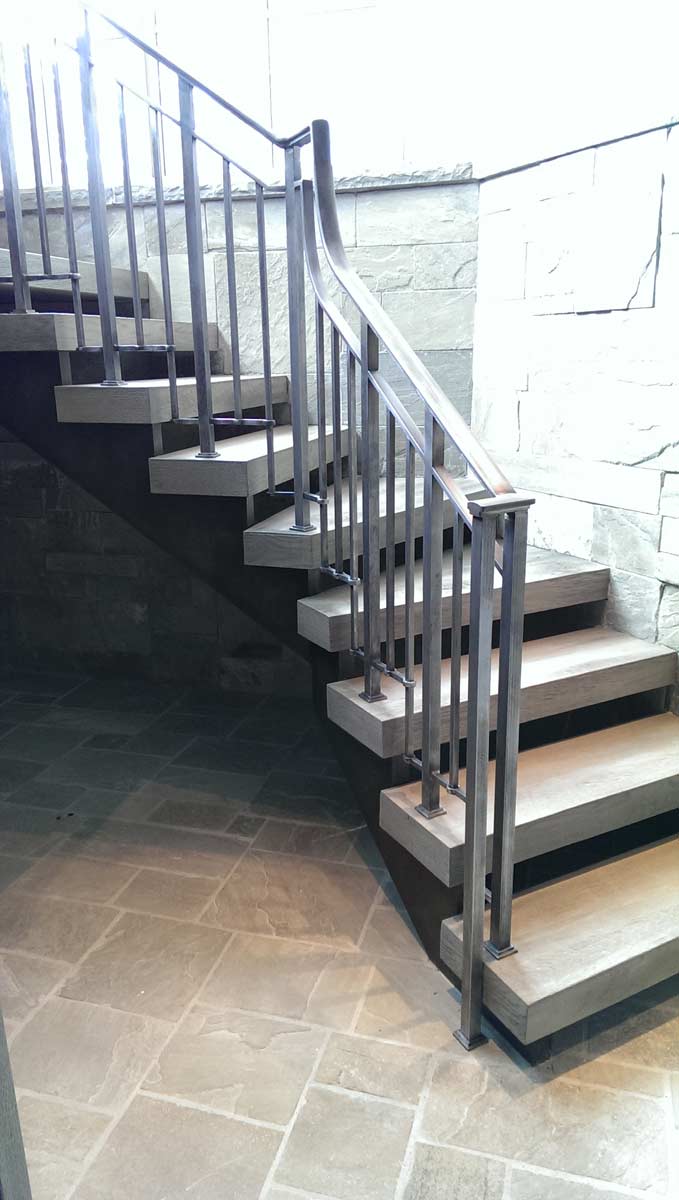This contemporary staircase brings a striking sophistication to this custom home. Contemporary designs tend to cut out the clutter and embrace sleek simplicity without actually being minimalist. Absolute care was taken in this design to even the smallest details making it anything but minimalist. The European White oak treads have been both circle sawn and band sawn to create a beautiful texture and then given a white washed finish. The steel guard rail was completely custom designed and includes a mill finish, which consists of wire brushing all of the steel to make it smooth and shiny and then sealing it with bees wax. This highlights the various tones in the steel and creates a more naturally finished appearance. In addition, the escutcheons were all individually laser cut and included in the design to visually enhance the point at which the balusters were inserted into the treads. Each element worked together seamlessly to create a magnificent and flawless design.