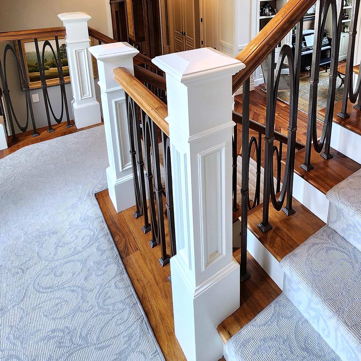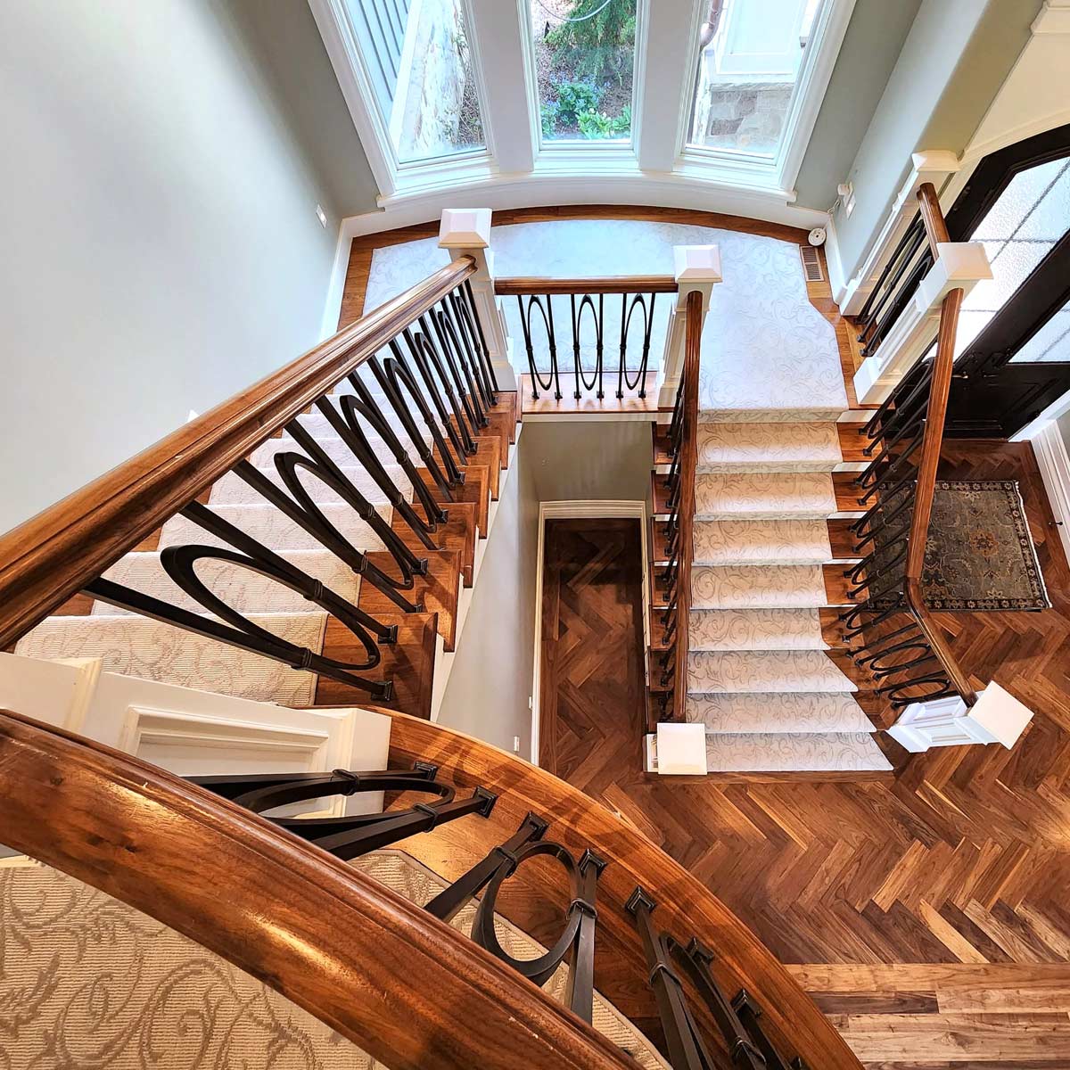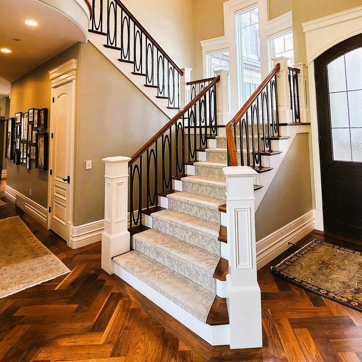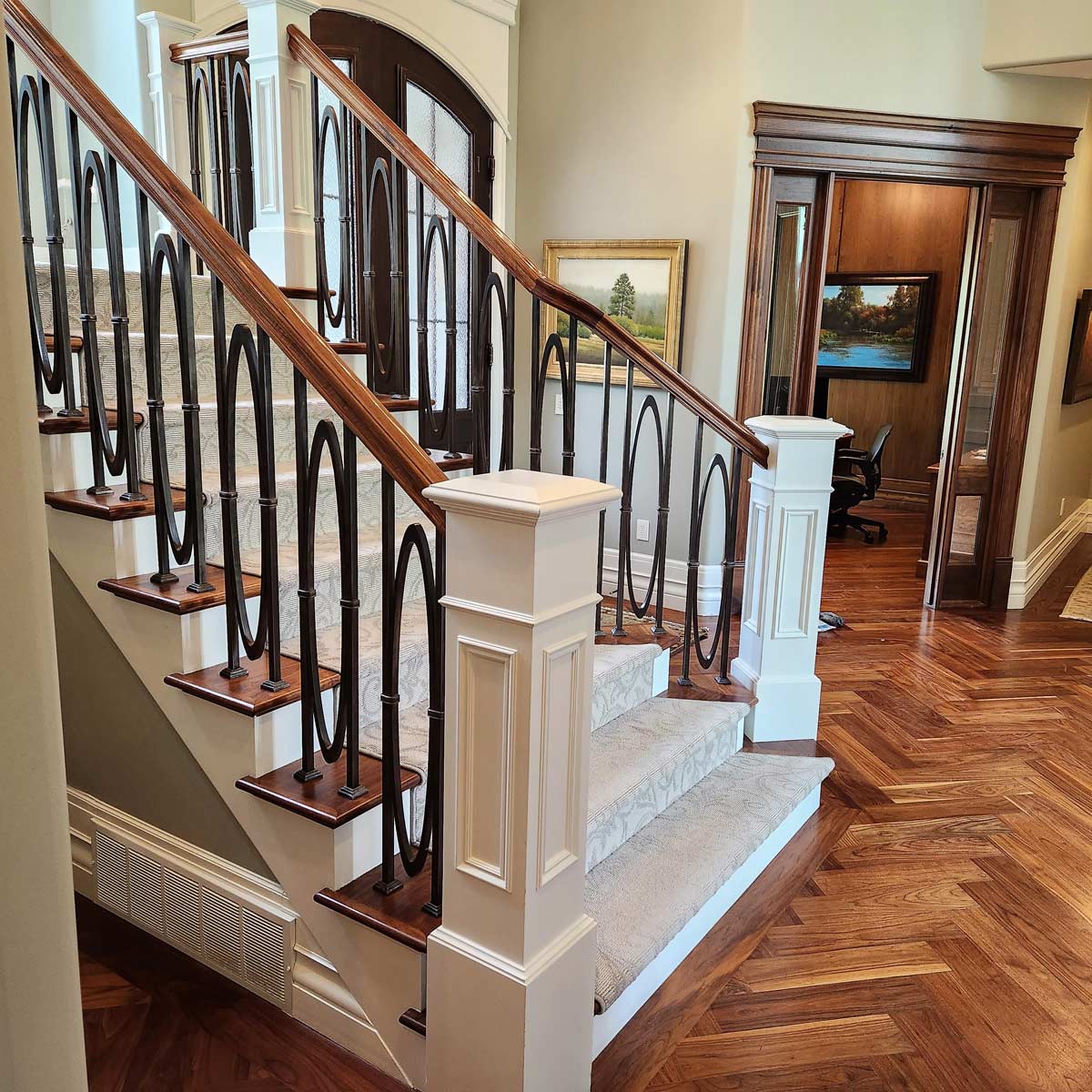 While the layout of the staircase may be common, the steel balusters are anything but! These custom designed and fabricated 3/4″ thick steel baluster panels were made exclusive for this client and include a laser cut elongated steel oval with a gun blue patina and wax finish. Add in the Walnut treads, handrail, and herringbone hardwood floor and it’s a design to stand the test of time! We absolutely love being able to create unique pieces that elevate the staircase to the next level. Enjoy!