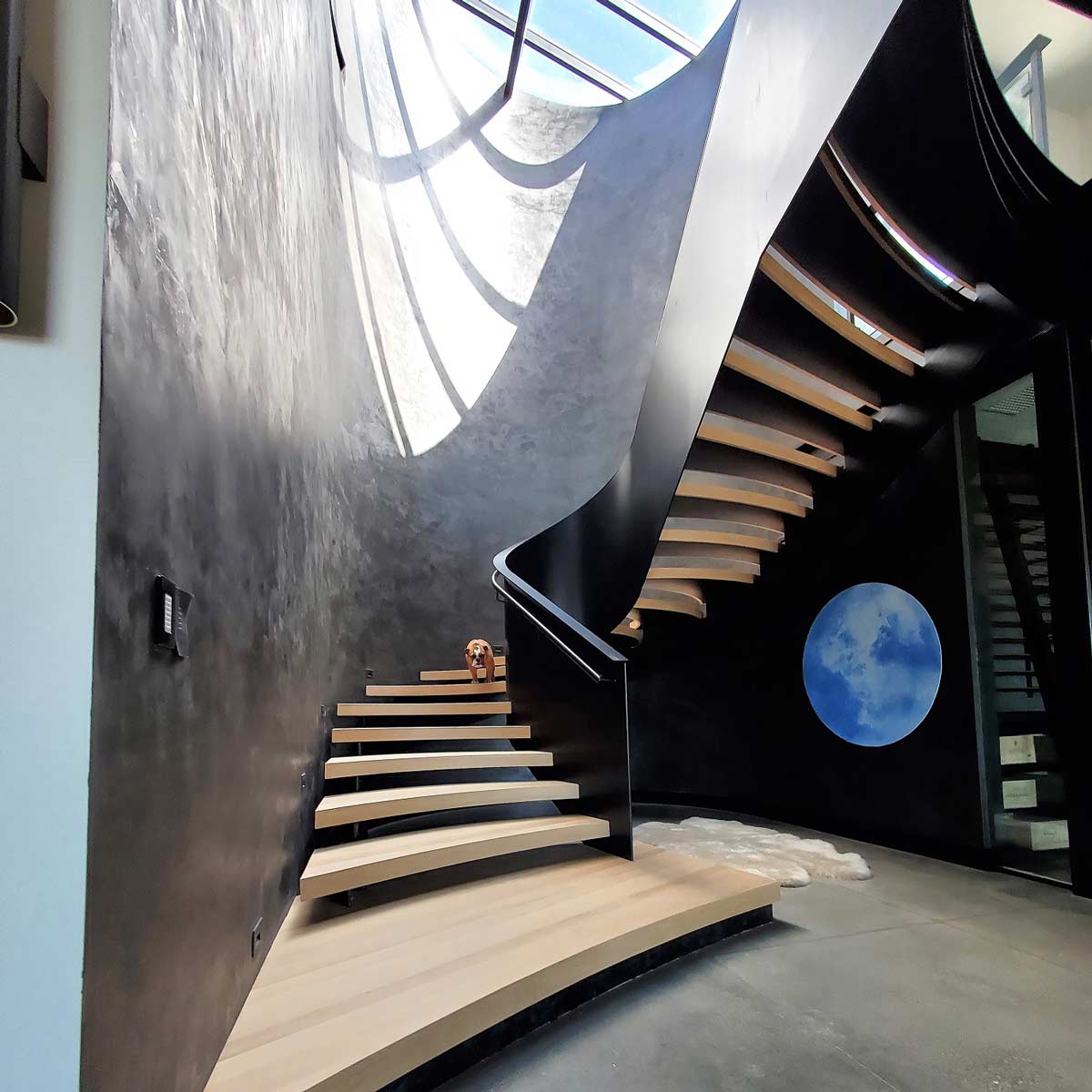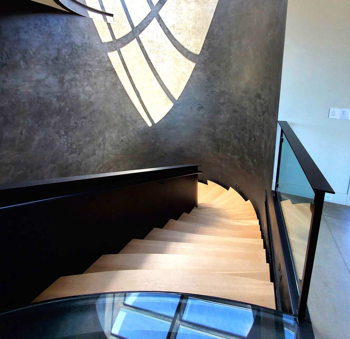 Smooth contemporary lines combined with organic shapes and contrasting tones make this staircase as unique, beautiful, and sophisticated as the people it serves. This one resides in the Victory Ranch community of Kamas, Utah and is a combination of blackened steel and natural Rift White Oak.