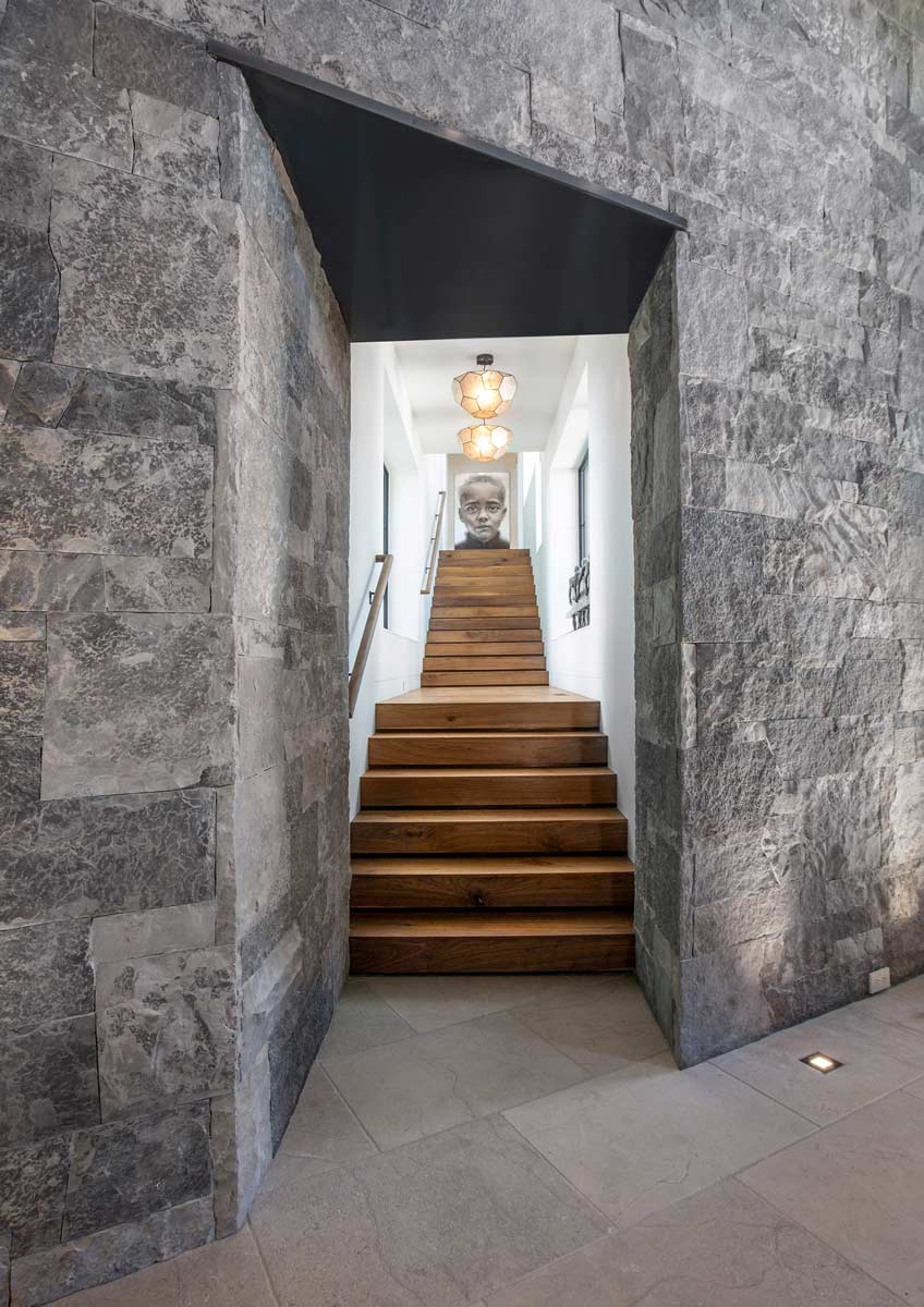 The warmth and texture of these thick block style Europian White Oak stairs coordinates beautifully with the surounding stone and stark white walls, creating a truely compelling corridor.