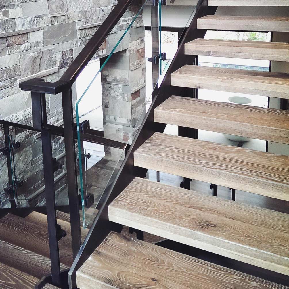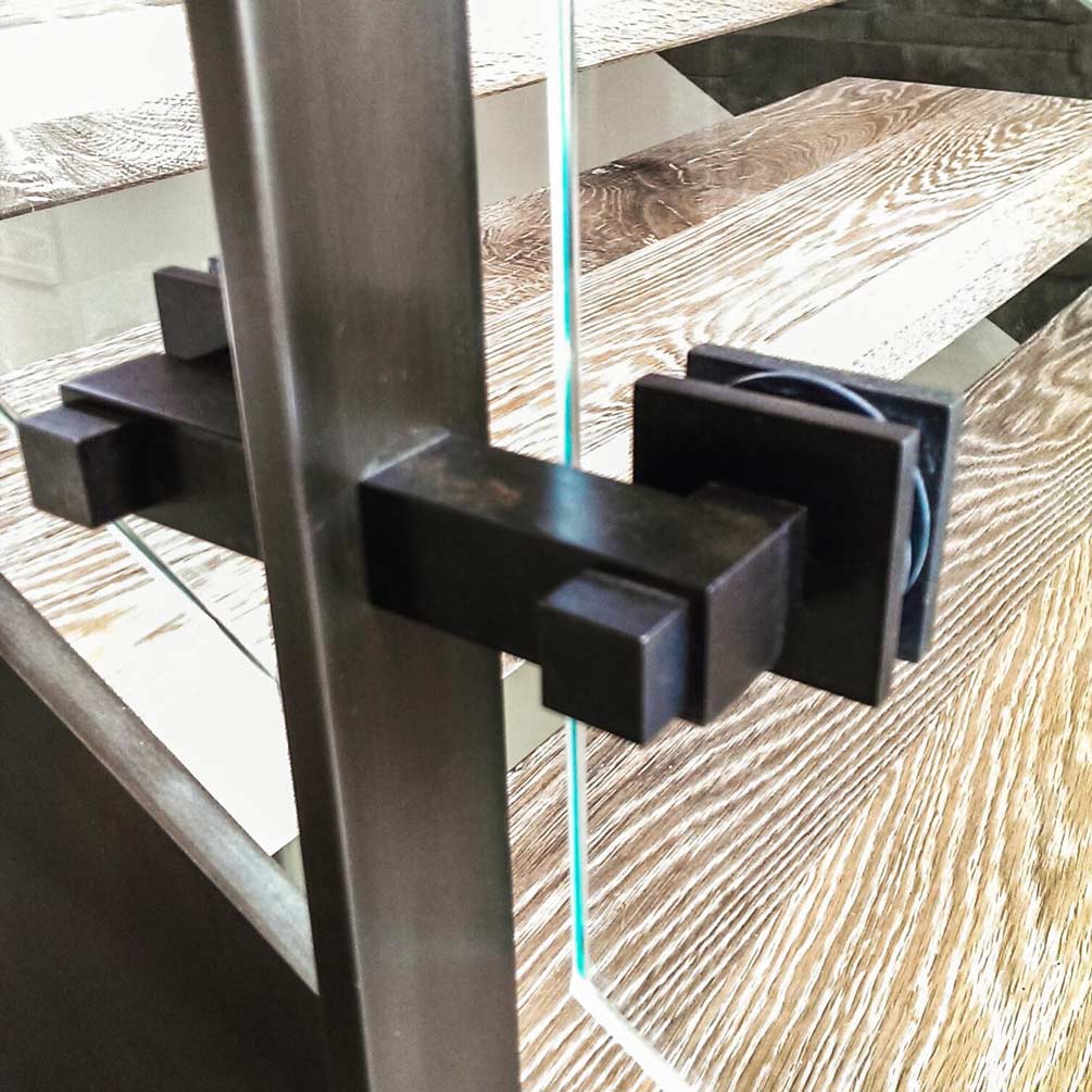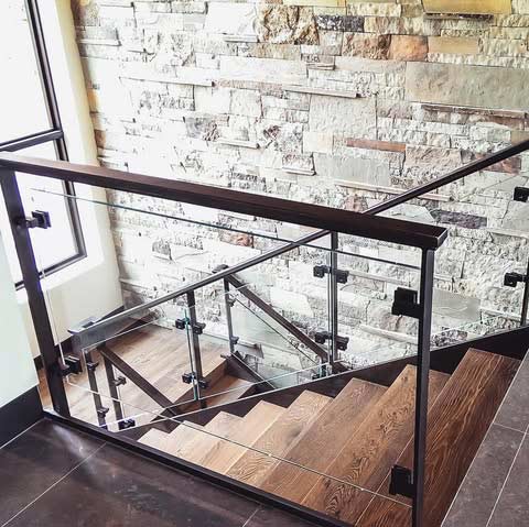 Glass railings are sleek and elegant and bring an upscale look to any design while also providing more light and openness to the area. They can be a beautiful complement to any style staircase. This stunning staircase is a Mountain Contemporary style, with an Industrial touch, in that the bolt heads and rivets are exposed in some places. 1/2″ Low Iron glass panels were mounted between the posts with custom designed and custom machined square glass clamps. The freestanding open rise stairs are on 1/2″ x 12″ plate steel stringers. The block treads were made from actual European White Oak lumber that was imported from Europe and then wire brushed to accentuate the beautiful grain. All the steel, including the handrail, received a patina and bee’s wax finish. This project was completed in White Pine, Park City, Utah, in a spectacular home constructed by @mcchomes, one of the best home builders out there!