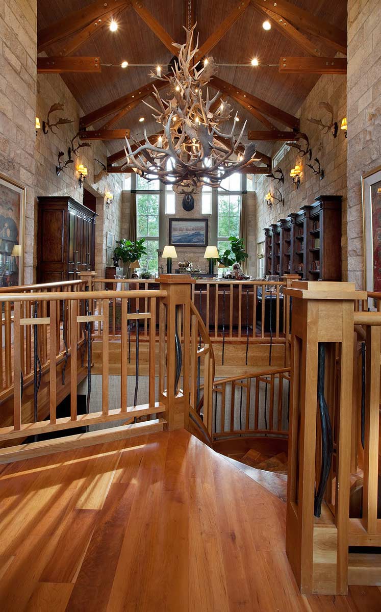 This amazing project in Midway, Utah features a freestanding elliptical stair includes a grid guardrail integrating custom made hammered steel balusters, both in the guardrail infill and within the open paneled box newels. And how about that stone inlay in the treads! It all makes for one very unique and very detailed show piece.