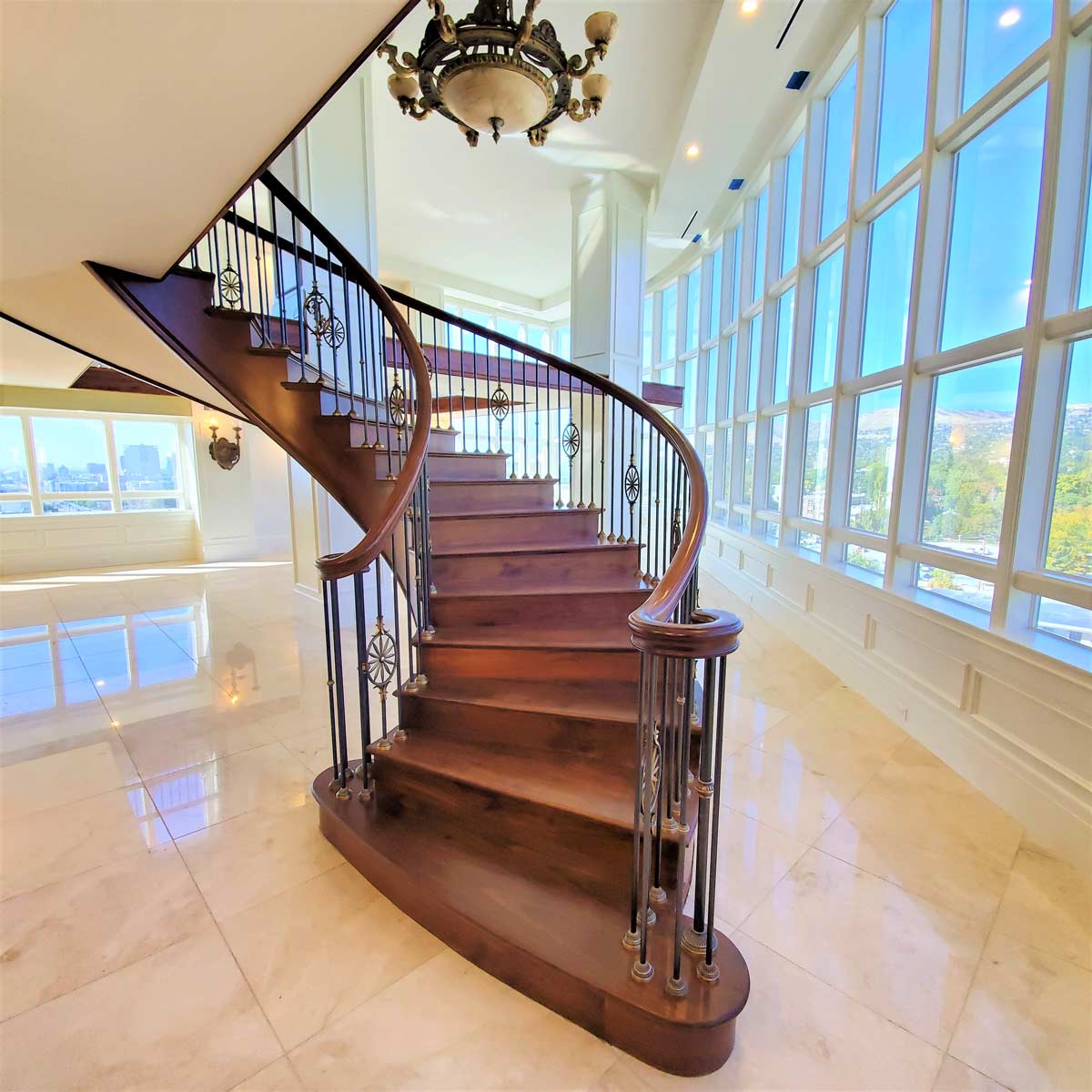This luxurious free-standing staircase is a stunner! A truly stately centerpiece for this high-rise penthouse overlooking downtown Salt Lake City. The stair parts alone were too large to bring in through the building’s service stairs or elevator. So we had to shut down the street below, crane the stringers and rails in through a window, and assemble it inside the unit. The stair and handrail are Black Walnut and the guardrail was completed with hand made steel balusters. The custom forged bronze flower and knuckle elements were made for us in New York by @jozefcustom specifically for this client, including a “JP” monogrammed oval. All of the bronze elements received an aged patina and the 5/8″ round steel a gun blue. We love customizing staircases to reflect an owner’s personality and style.