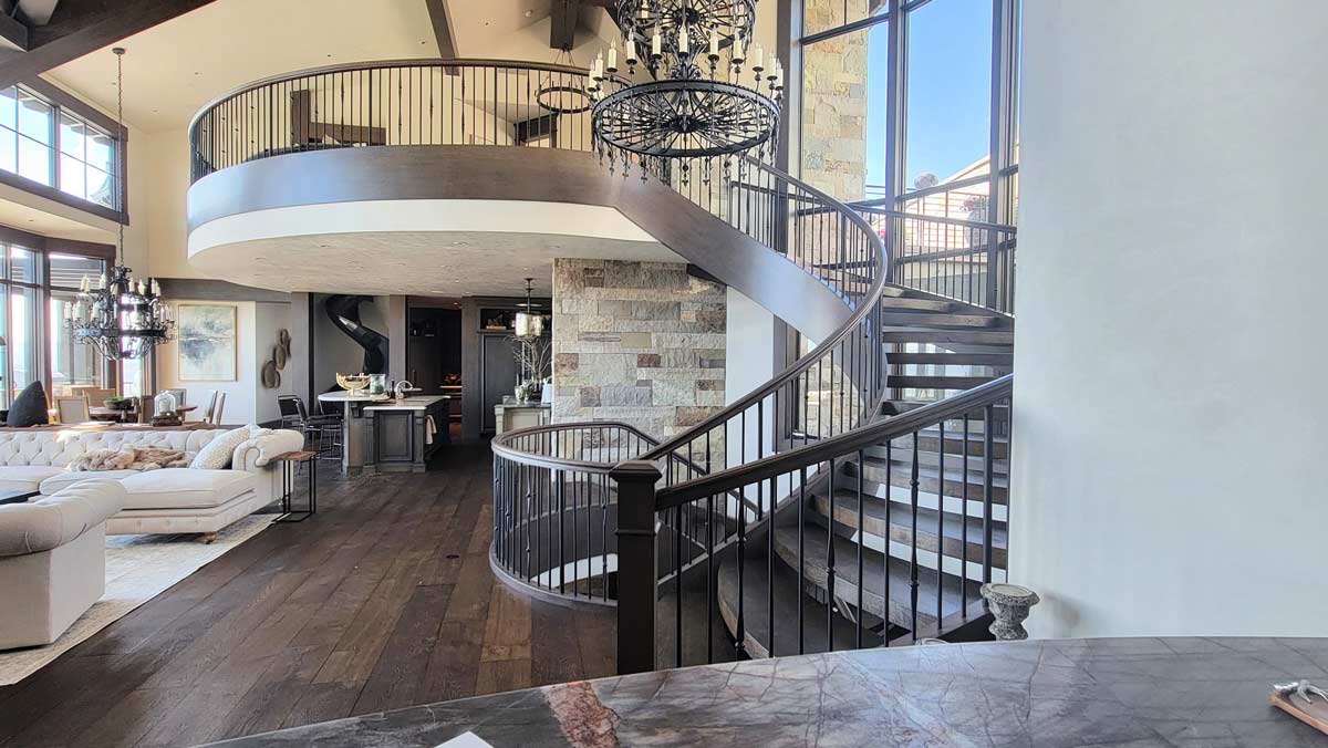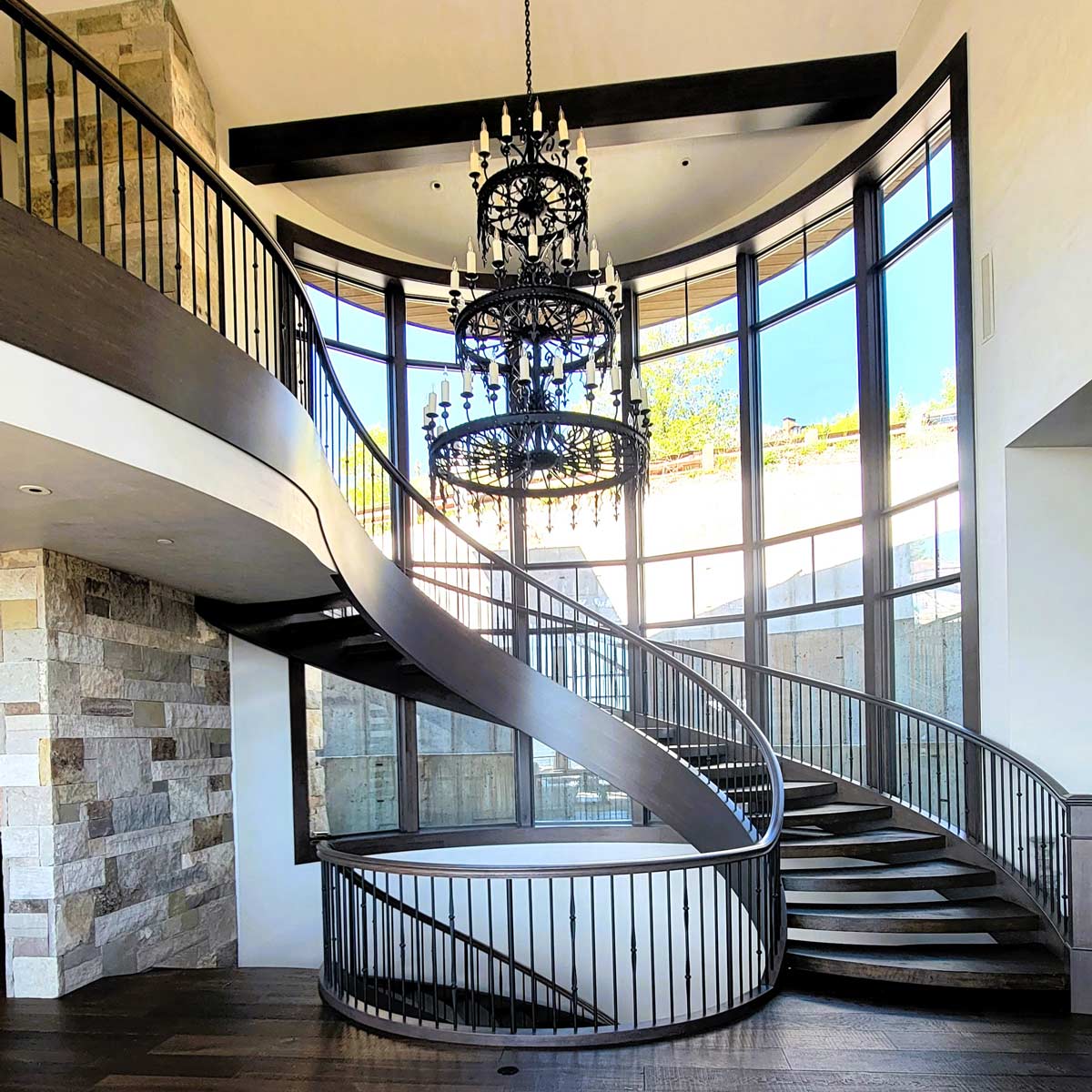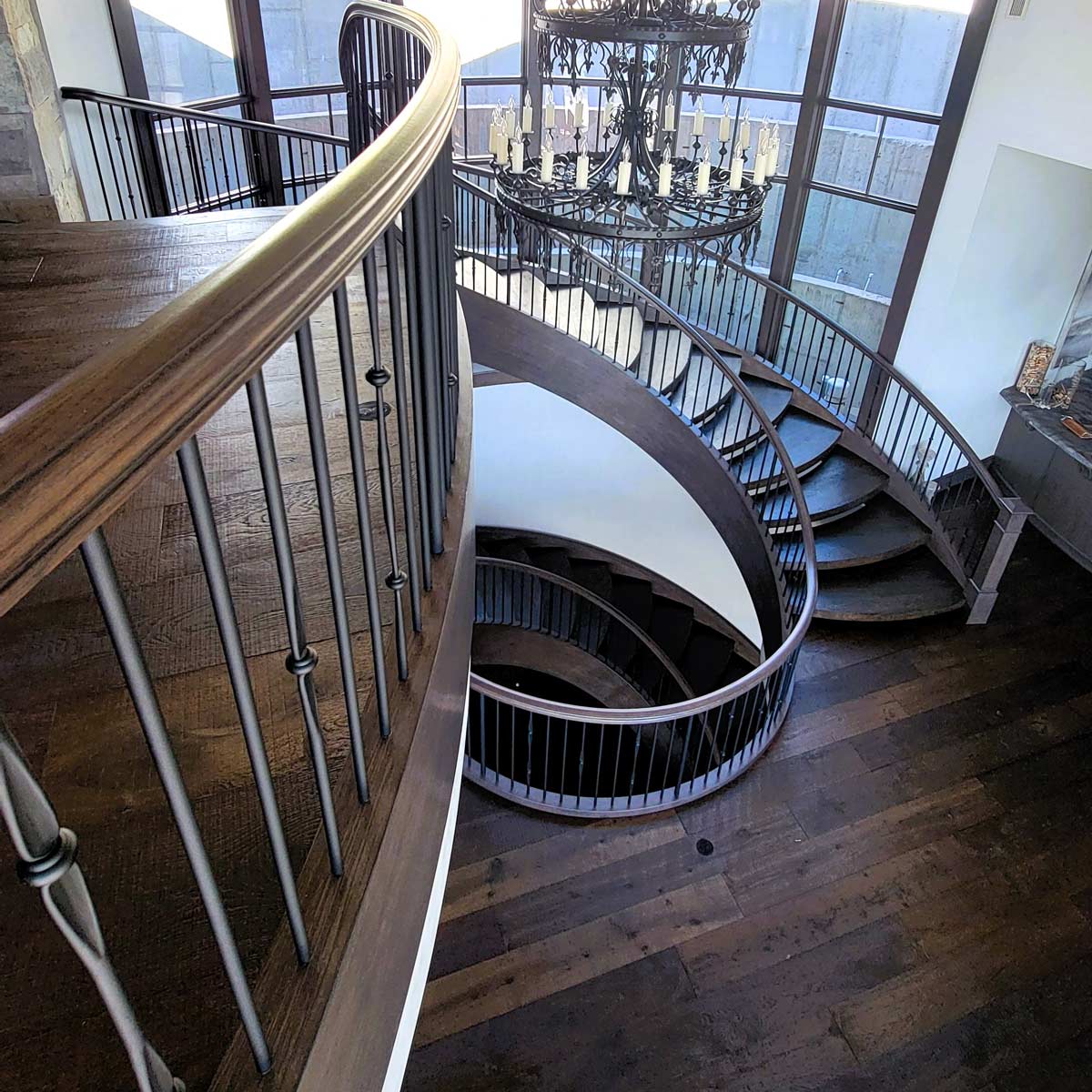 Another beautiful traditional free-standing circular stair project. This time with Rift Red Oak stringers and handrail, and radius block treads made from European White Oak purchased and shipped in from Europe. These treads match the hardwood floors exactly including the band sawn and wire brushed textured surface.